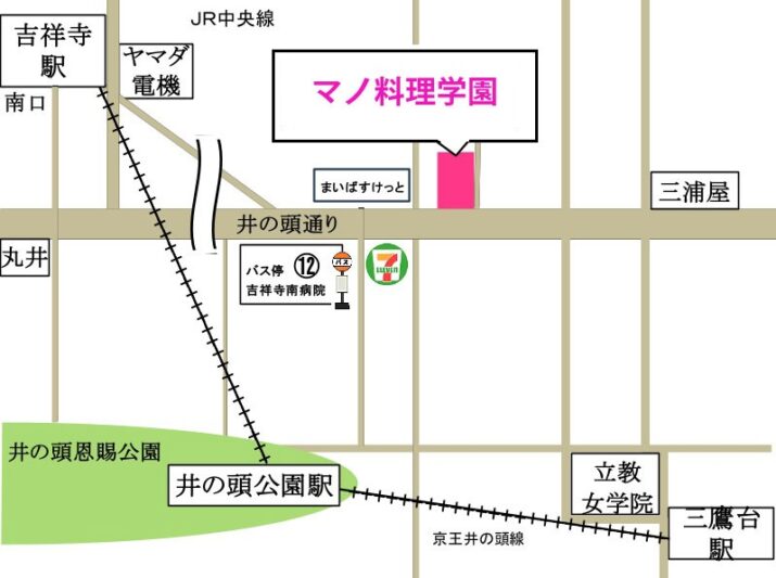 アクセス 2015年12月16日 に Mano cooking が投稿 Google map 〒180-0003 東京都武蔵野市吉祥寺南町4-15-8 TEL/FAX:0422-46-0003 JR中央線/京王井の頭線「吉祥寺駅」 南口下車徒歩13分 北口よりムーバス東循環利用 12番バス停 で下車 徒歩1分 (吉祥寺~ 乗車時間約15分) 京王井の頭線 井の頭公園駅 徒歩12分